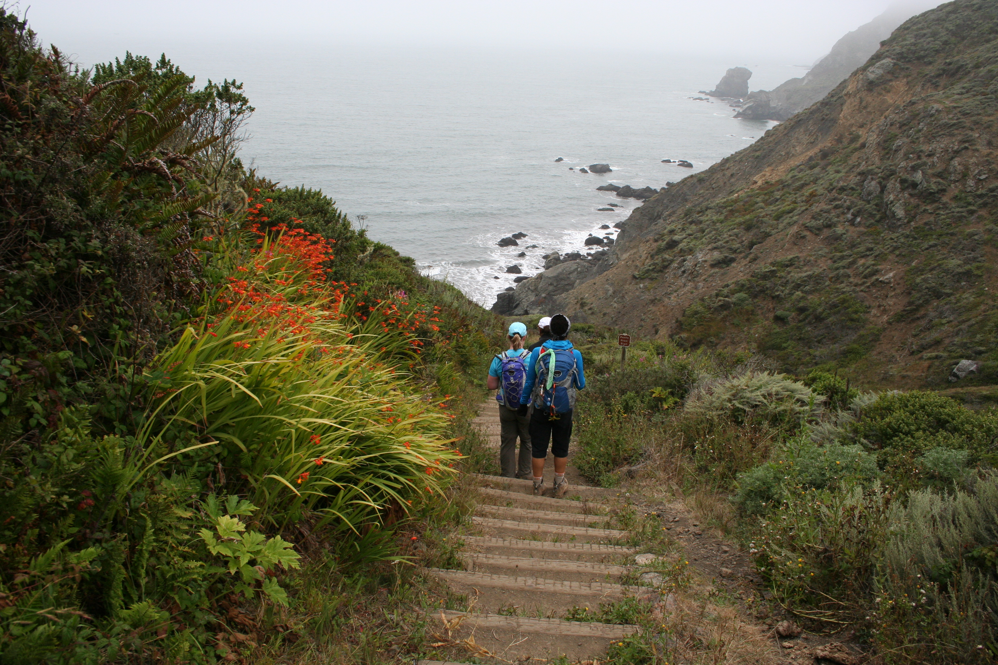4. Stick with the Coastal Trail as it hugs the shoreline ridge with frequent ocean views. This is a fairly moderate trail with some steep ups and downs and even some stairs; if you have any knee issues at all, I recommend bringing those hiking poles. You’ll pass a few key intersections on your way to Muir Beach including the Coastal Trail Fire Road and a short jaunt down to Pirates Cove; if your want to extend the hike slightly, Pirates Cove (on your left) is worth the stairs down and back up.