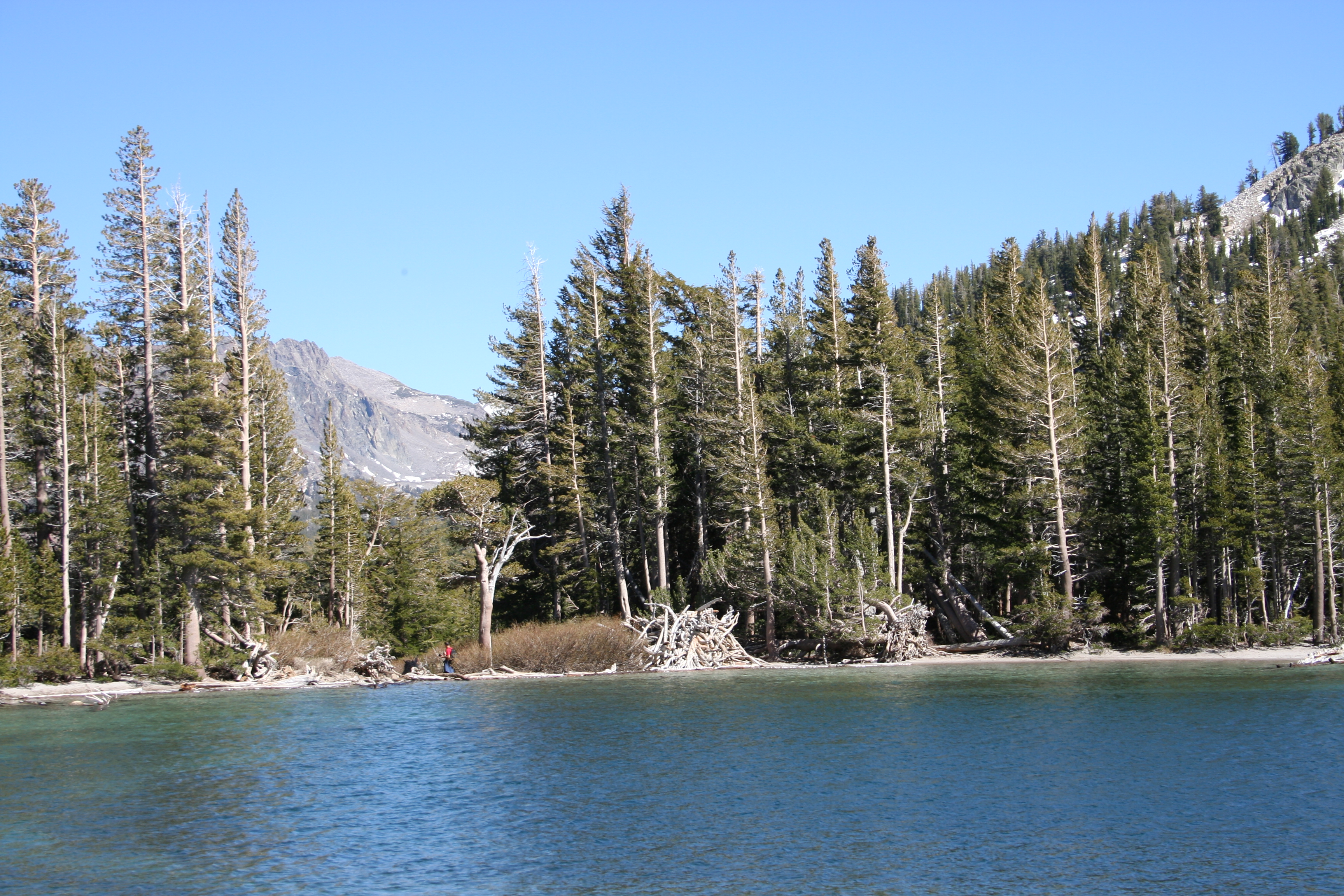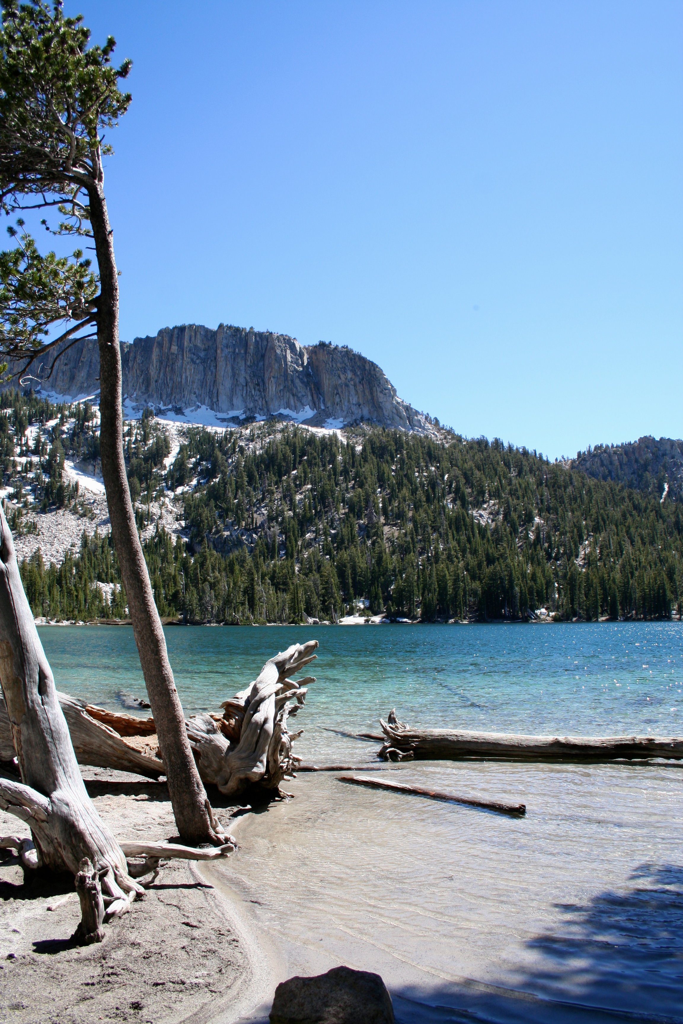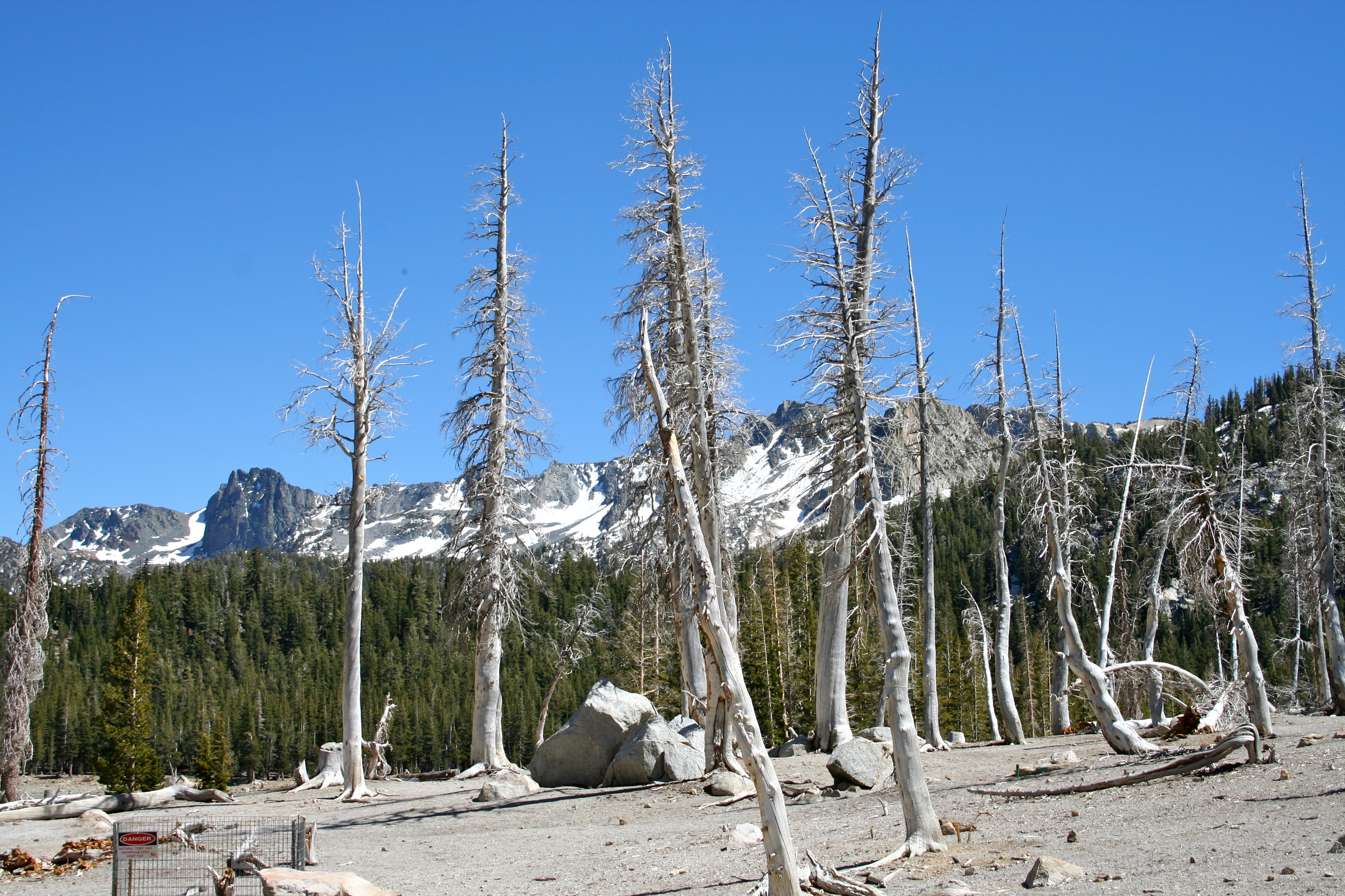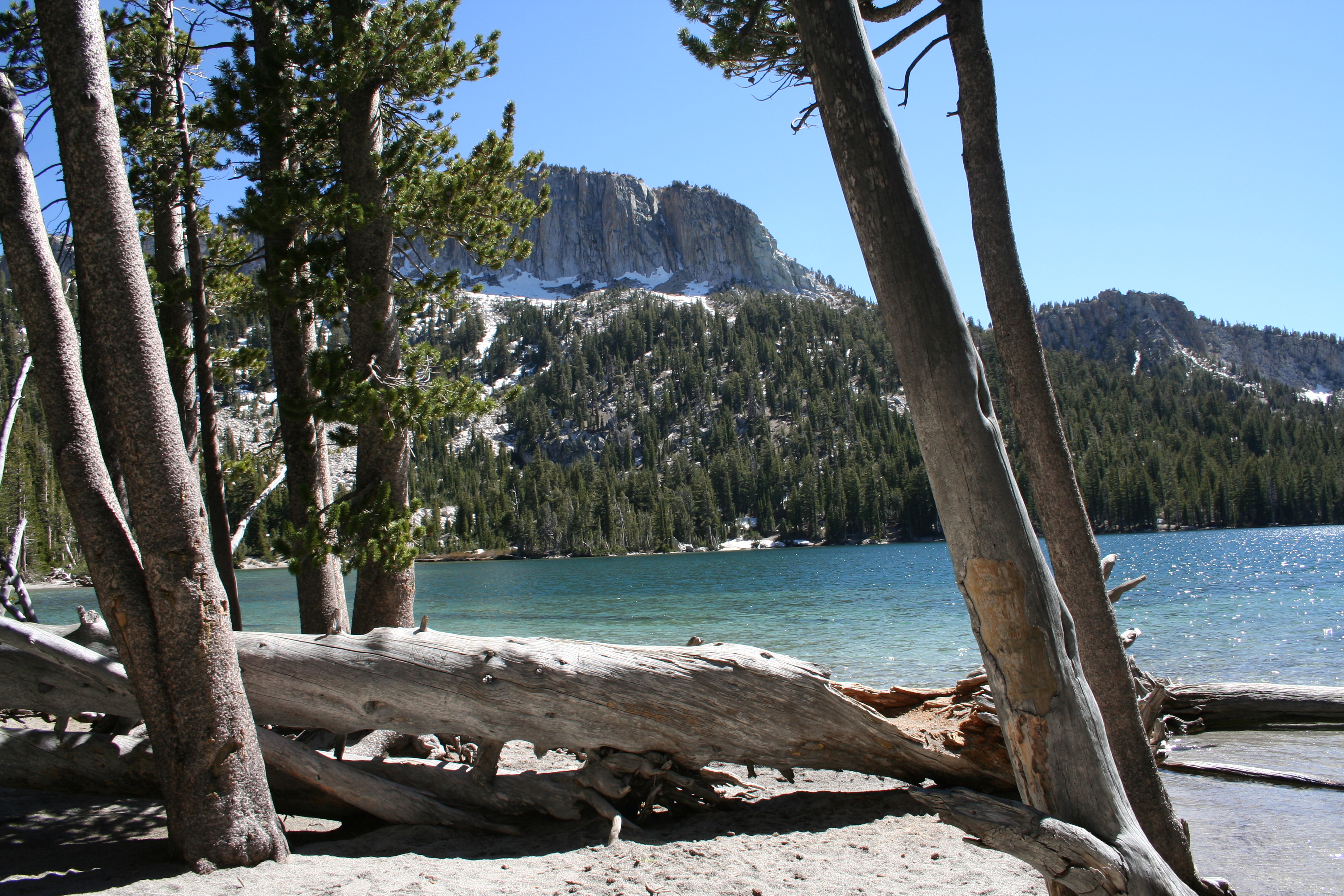 The Mammoth high country in the Eastern Sierras (just to the east of Yosemite) offers great camping and hiking away from the national park crowds. This easy hike southwest of the winter ski town of Mammoth Lakes gives you a taste of what the high Sierras have to offer – pristine lakes, amazing oft-snowcapped mountain peaks and jagged rock outcroppings. The hike starts where Route 203/Lake Mary Road ends at Horseshoe Lake in the Inyo National Forest. You’ll ascend through a ghostly forest of white, barren trees killed by carbon dioxide emanating from the earth beneath into the subalpine forest to your destination of McLeod Lake. After spending some time at the lake with the local dog owners and their very happy canines, you’ll climb a little higher before descending back to the parking lot.