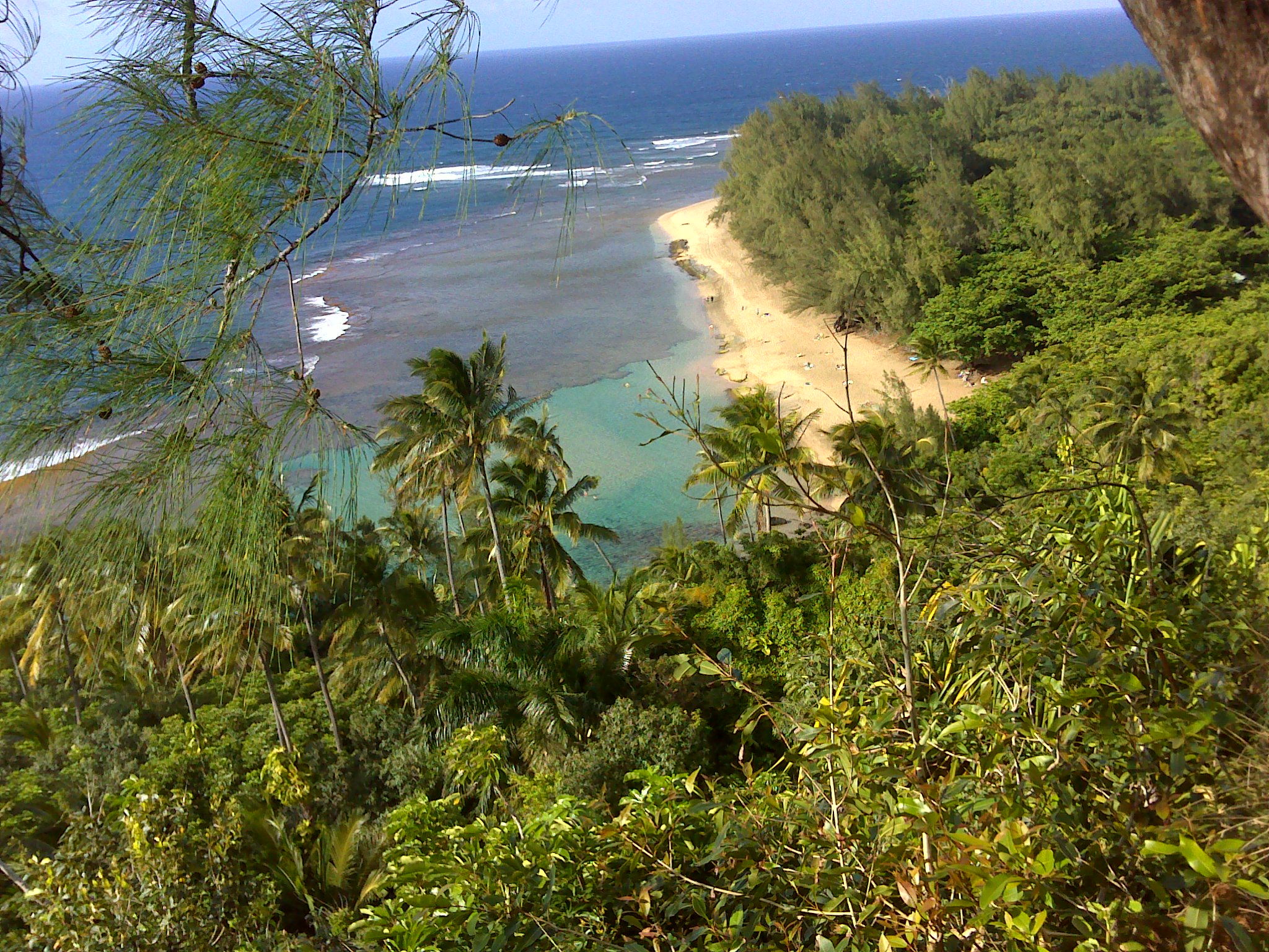 The first view of Hankapi'ai Beach beneath the Kalalau Trail