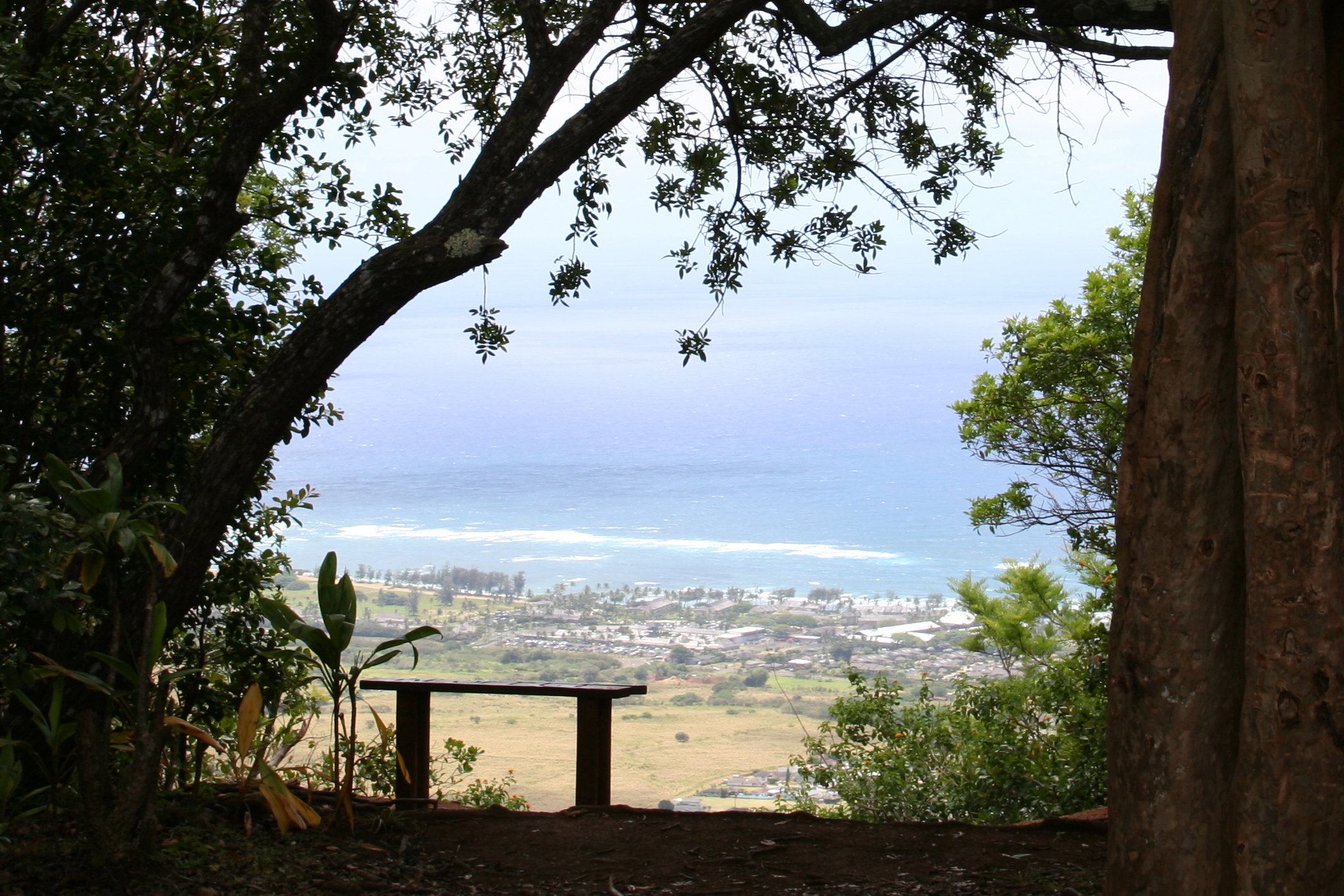 A bench at the picnic area near the top of Sleeping Giant offers gorgeous views of Kauai's eastern shore.