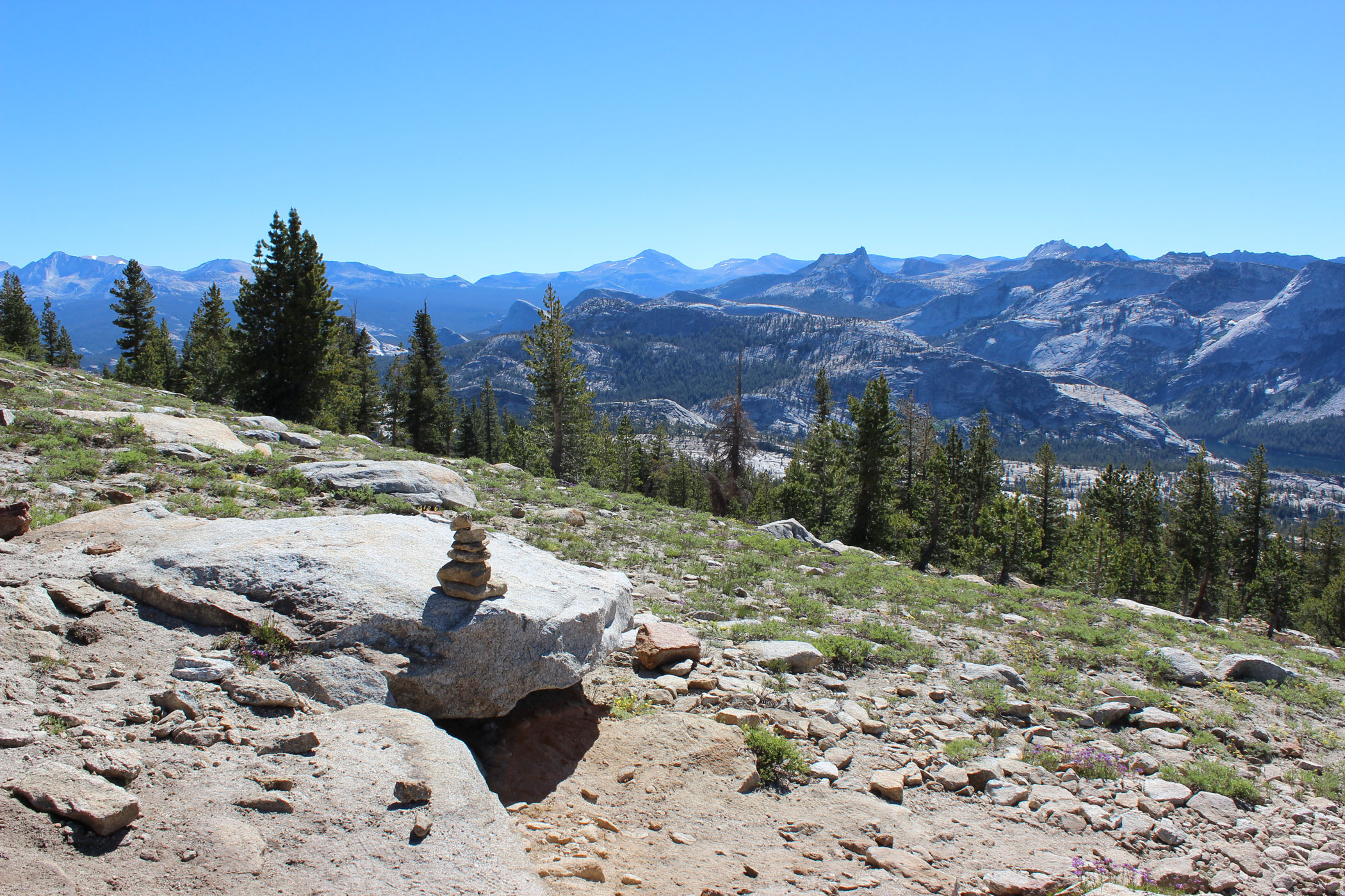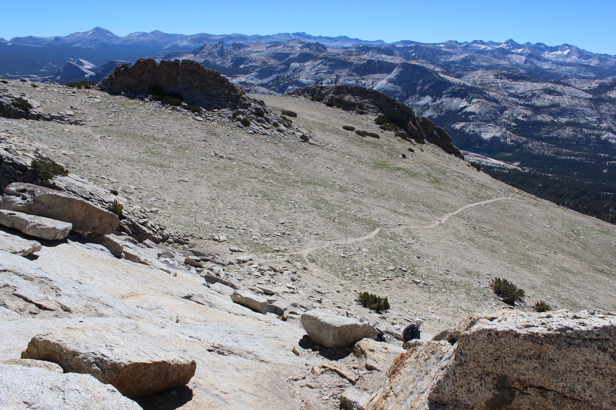 1. The trail to Mount Hoffman is completely unmarked, but well-enough traveled to be fairly easy to follow when the ground is snow-free. To find the trail from May Lake High Sierra Camp simply follow the path next to May Lake as it wraps around the southern edge of the lake, just beyond the backpacker camp sites.